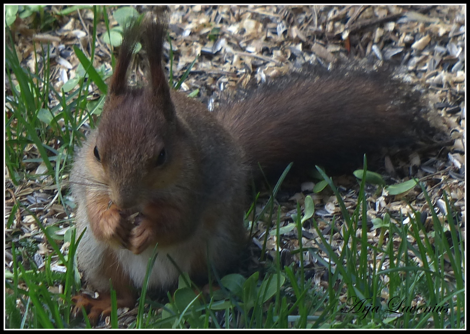 Jonkin ajan kuluttua huomasin oravan olevan maassa syömässä ja otin kuvia ikkunan läpi, kun en halunnut mennä ruokarauhaansa häiritsemään.