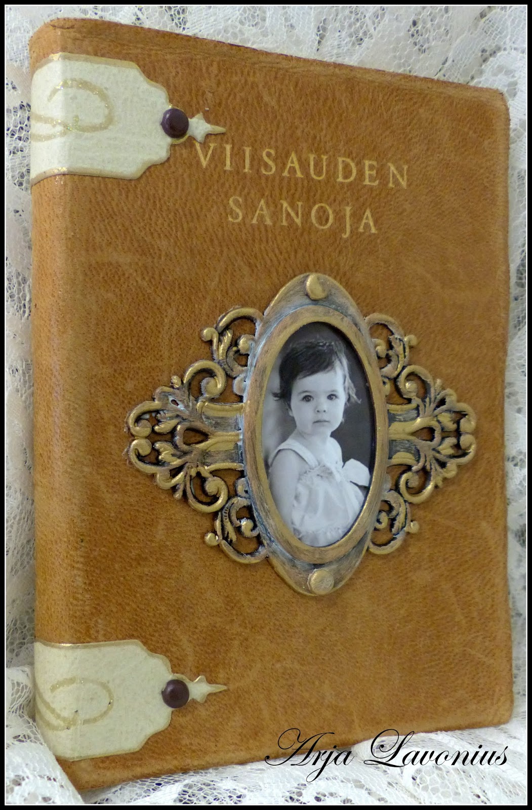 Monta kuukautta sitten löysin kirpparilta eurolla nahkakantisen kirjan "Viisaita sanoja". Kirja on kooltaan 12x8,5x1,5 cm, ei sellanen virsikirjan kokoinen. Alkuperäinen suunnitelma oli toisenlainen, mutta kun ei sitä tullut aloitettua niin päässä muhikin uusi suunnitelma, altered book.