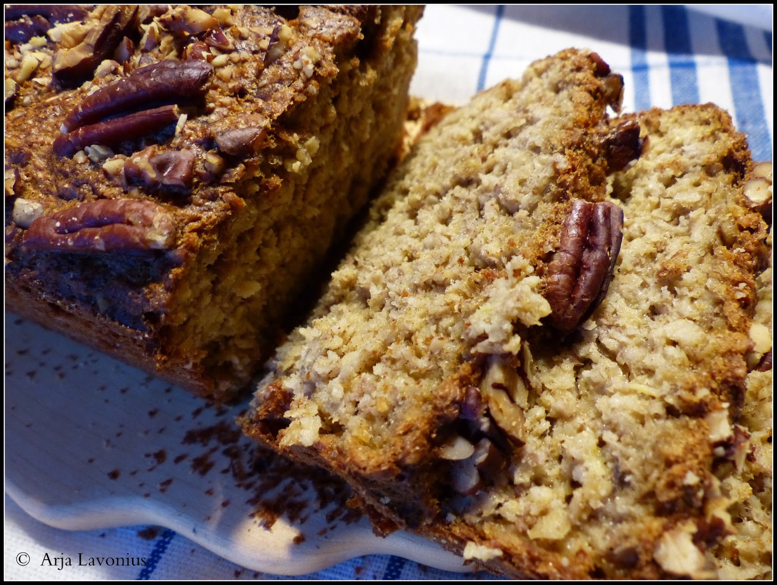 Soseuta banaanit, sekoita kaurajauhoihin leivinjauhe ja kaurahiutaleet. Sekoita banaanin joukkoon jauhot, mausteet, munat ja öljy. Kaada voideltuun leipävuokaan. Ohjeessa halkaistaan kokonainen banaani pituussunnassa ja painetaan taikinan päälle ja lisäksi pekaanipähkinöitä. Jätin päältä banaanin pois ja laitoin vain pekaanipähkinöitä. Paista175 asteessa 40-45 min.